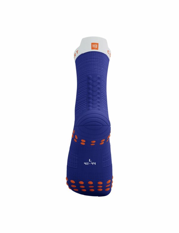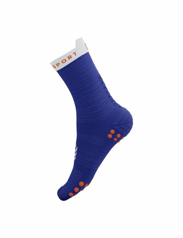 Performance evolves. And so do running socks. For the brand new generation of our bestselling Pro Racing Socks Run, we asked Compressport runners to tell us exactly what they liked, needed and wanted. The result is a running sock designed specifically to offer optimal aeration and blister-protection as you stride towards your next PB. The technical weave is lightweight and ventilated, quickly wicking away moisture so your feet remain fresh and dry, even in warmer conditions. A brand new, wider toe box offers a more ergonomic fit and improved proprioception, allowing the toes to grip intuitively on landing for a natural, fluid stride. A light knit around the ankle offers targeted support when you pick up the pace, while terry cloth padding on the big toe saves you from blackened nails on longer runs. The medium arch support boosts micro circulation and prevents the fabric from twisting and folding, saving you from painful blisters and irritation. Over the Achilles tendon, two lines of 3D.Dots add protection and support. They surround a row of brand new Flat.Dots for added ventilation. Underfoot, a pattern of 3D.Dots (75%) and Flat.Dots (25%) cushions impact and offers added grip and ventilation as well as a light micro stimulation, which helps increase venous return and delay fatigue as the miles build up.The height is lower than the trail and bike models, with a fit and technologies that are specifically designed for the demands of road running. An ergonomic tab at the back adds a touch of comfort and style and, should you forget which activity you`re heading out the door for, the discipline is discreetly embroidered on the inside. The elegant design of this high-tech sock is true to our performance DNA, so all that is left for you to do is to hit the road with speed, comfort and class.