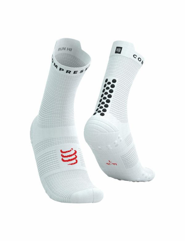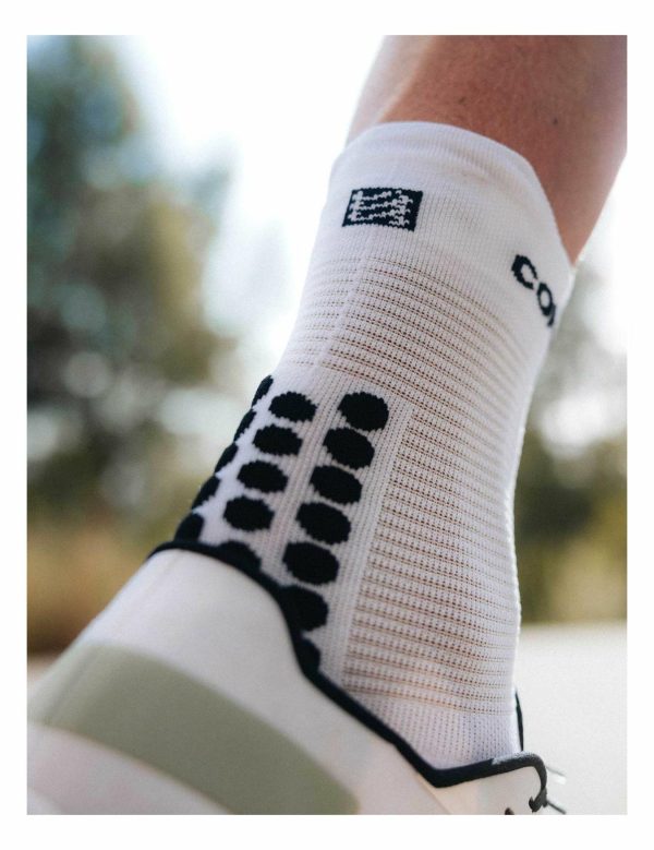 Performance evolves. And so do running socks. For the brand new generation of our bestselling Pro Racing Socks Run, we asked Compressport runners to tell us exactly what they liked, needed and wanted. The result is a running sock designed specifically to offer optimal aeration and blister-protection as you stride towards your next PB. The technical weave is lightweight and ventilated, quickly wicking away moisture so your feet remain fresh and dry, even in warmer conditions. A brand new, wider toe box offers a more ergonomic fit and improved proprioception, allowing the toes to grip intuitively on landing for a natural, fluid stride. A light knit around the ankle offers targeted support when you pick up the pace, while terry cloth padding on the big toe saves you from blackened nails on longer runs. The medium arch support boosts micro circulation and prevents the fabric from twisting and folding, saving you from painful blisters and irritation. Over the Achilles tendon, two lines of 3D.Dots add protection and support. They surround a row of brand new Flat.Dots for added ventilation. Underfoot, a pattern of 3D.Dots (75%) and Flat.Dots (25%) cushions impact and offers added grip and ventilation as well as a light micro stimulation, which helps increase venous return and delay fatigue as the miles build up.The height is lower than the trail and bike models, with a fit and technologies that are specifically designed for the demands of road running. An ergonomic tab at the back adds a touch of comfort and style and, should you forget which activity you’re heading out the door for, the discipline is discreetly embroidered on the inside. The elegant design of this high-tech sock is true to our performance DNA, so all that is left for you to do is to hit the road with speed, comfort and class.