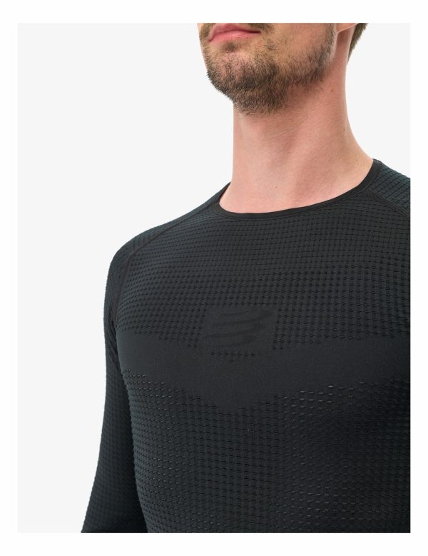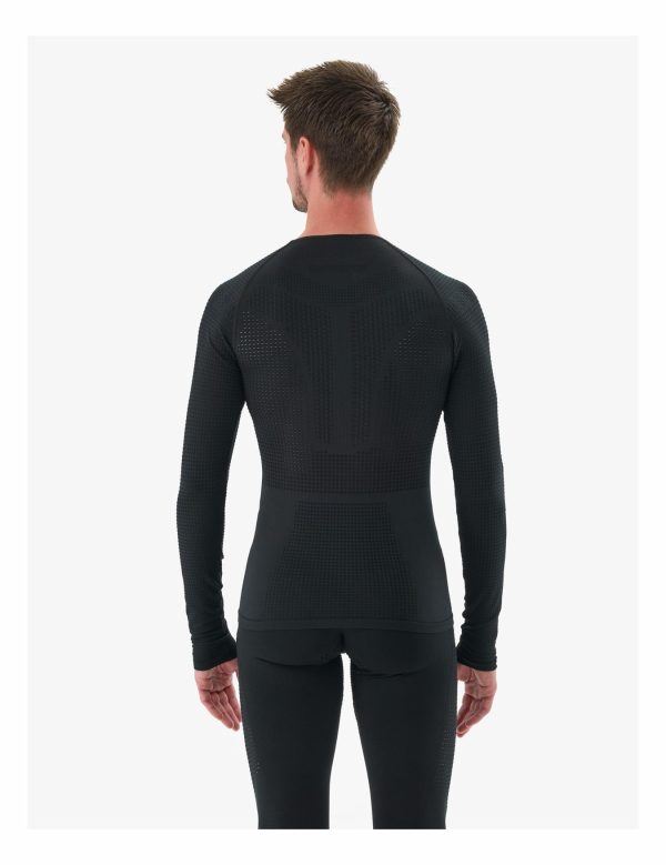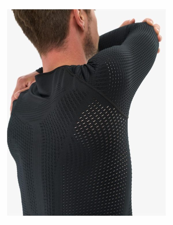 In the depths of winter, choosing the right baselayer can be the difference between staying out and cutting your session short. Ideal for all outdoor sports, the On/Off Base Layer long-sleeved Top is created using our unique On/Off technology that literally breathes with you to regulate ventilation and protection depending on the intensity of your workout. As intensity ramps up, your chest expands to take in oxygen, and as it does so the alveoli in the fabric open up to reduce compression and increase breathability. If your effort decreases, when going downhill for example, these alveoli close again to protect you and retain warmth. Clever body-mapping means these perforations vary in size depending on the area of the torso, with larger openings in less sensitive zones such as the ribcage and smaller ones around the neck and wrists. The result is quick-drying, high-performance thermoregulation, keeping your core temperature steady no matter the effort or the outside conditions. The close Ergo fit supports this high-tech effect, leaving no space for air daughts and ensuring maximum warmth during your workout. Our signature Spin Control technology is woven into the back to help you maintain correcture posture. The shirt is made from seamless microfiber that sits soft and chafe-free against your skin, with natural antibacterial properties that combat odors and irritation. The round neck adapts to any morphology for optimal comfort, while the Raglan sleeve design frees up the shoulder for complete range of motion. This is a baselayer that not only keeps you warm and dry, but also supports your effort, whatever the discipline and the intensity.