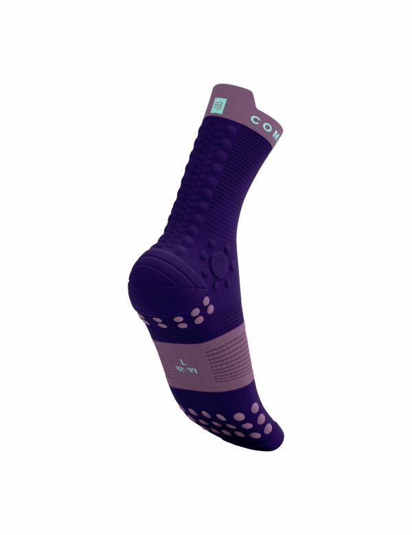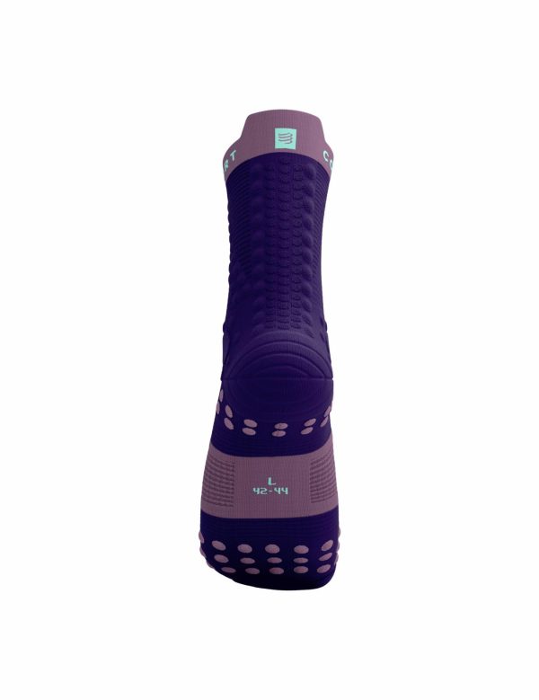 Trail running is not road running. Feet are constantly required to flex and adapt to ever-changing terrain, and footwear must follow the pace. Designed with shock absorption and protection in mind, the 4th generation Pro Racing Socks Trail take Compressport technologies up a notch to support all your off-road adventures. A trail-specific weave around the forefoot and lower leg is sturdy yet ventilated, quickly wicking away moisture to prevent irritation. The thicker instep fabric reaches higher than our running models for added protection, and a dedicated knit around the ankle offers reassuring stability in rocky terrain. A brand new, wider toe box offers a more ergonomic fit and improved proprioception, allowing the toes to grip and balance intuitively on uneven ground. Tough terry cloth padding covers all the toes to dampen impacts on fast, jarring descents. An improved 360° arch support boosts blood flow and stops the fabric from twisting and folding, avoiding blisters and irritation as the miles wear on. Signature dot technologies offer strategic protection from the outdoor elements in areas known to be problematic for trail runners. Both malleolus bones are covered by large sun-shaped dots to prevent bruising from flying feet. Two lateral rows of 3D.Dots cover the fibular muscles, stimulating the sensory receptors to improve proprioception and stability of the ankle. A wide pattern of 3D.Dots run up the Achilles tendon for added padding and support, surrounding a line of Flat.dots for ventilation. A denser weave underfoot further reduces vibration, with 3D.Dots cushioning impact and giving the foot a solid grip in the shoe. These dots also help increase venous return and delay fatigue so you feel fresher for longer. Higher than the Run Sock, the trail version offers increased protection to the lower leg and ankles, with more durable fabrics to resist the tests of nature. An ergonomic tab at the back adds a touch of comfort and, to ensure you don`t mistakenly pick the wrong sock, the discipline is discreetly embroidered on the inside. There are no two paths about it: this is a high-performance trail running sock that is as tough and durable as you are.
